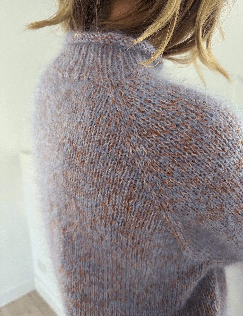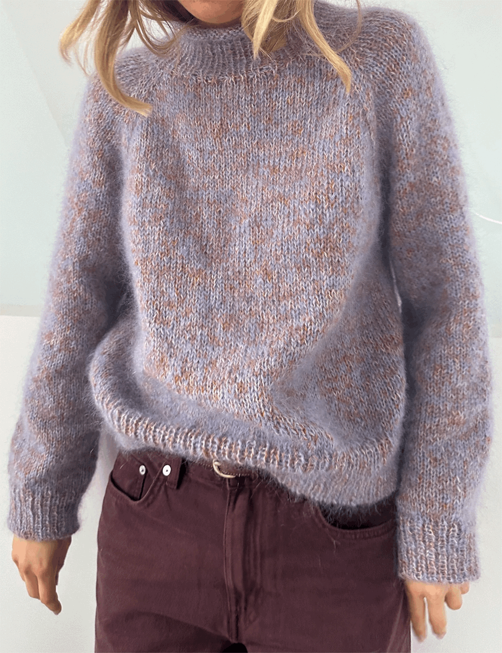 Foundation Sweater er en raglangenser som er enkel å gjøre til sin egen. Her har jeg laget en melange-versjon ved å strikke med 2 eller 3 tråder i forskjellig farge, tykkelse og tekster.