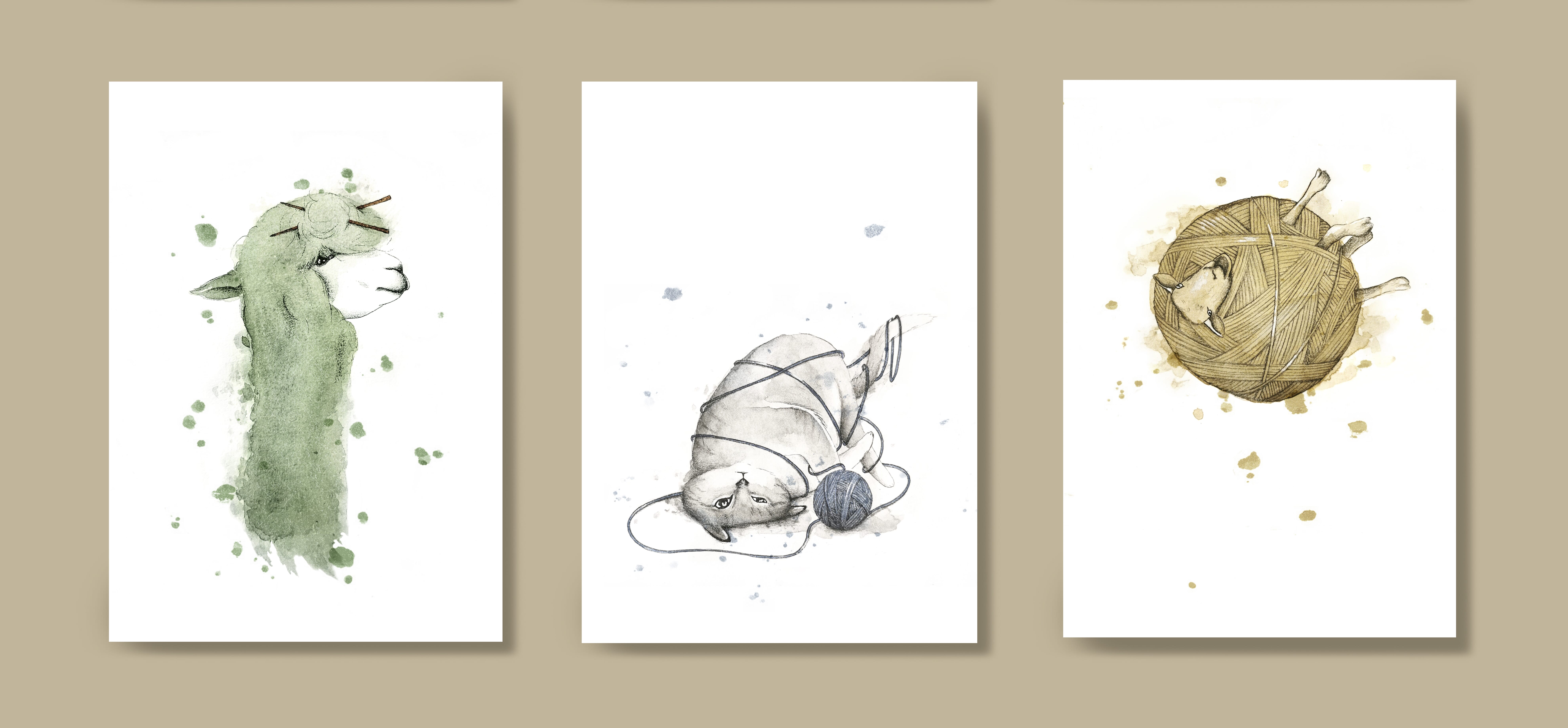 Vi er spesielt glad i garnnøster og skjønne kjæle- og husdyr, og flere av oss har opplevd utfordringen med begge i samme hus! Derav oppsto ideen om å få laget en hånd-illustrert kortserie om garnnøster i samspill med dyrevennene våre. Kortene kan henges på veggen i en fin ramme eller gi i gave til en strikkevenn.
