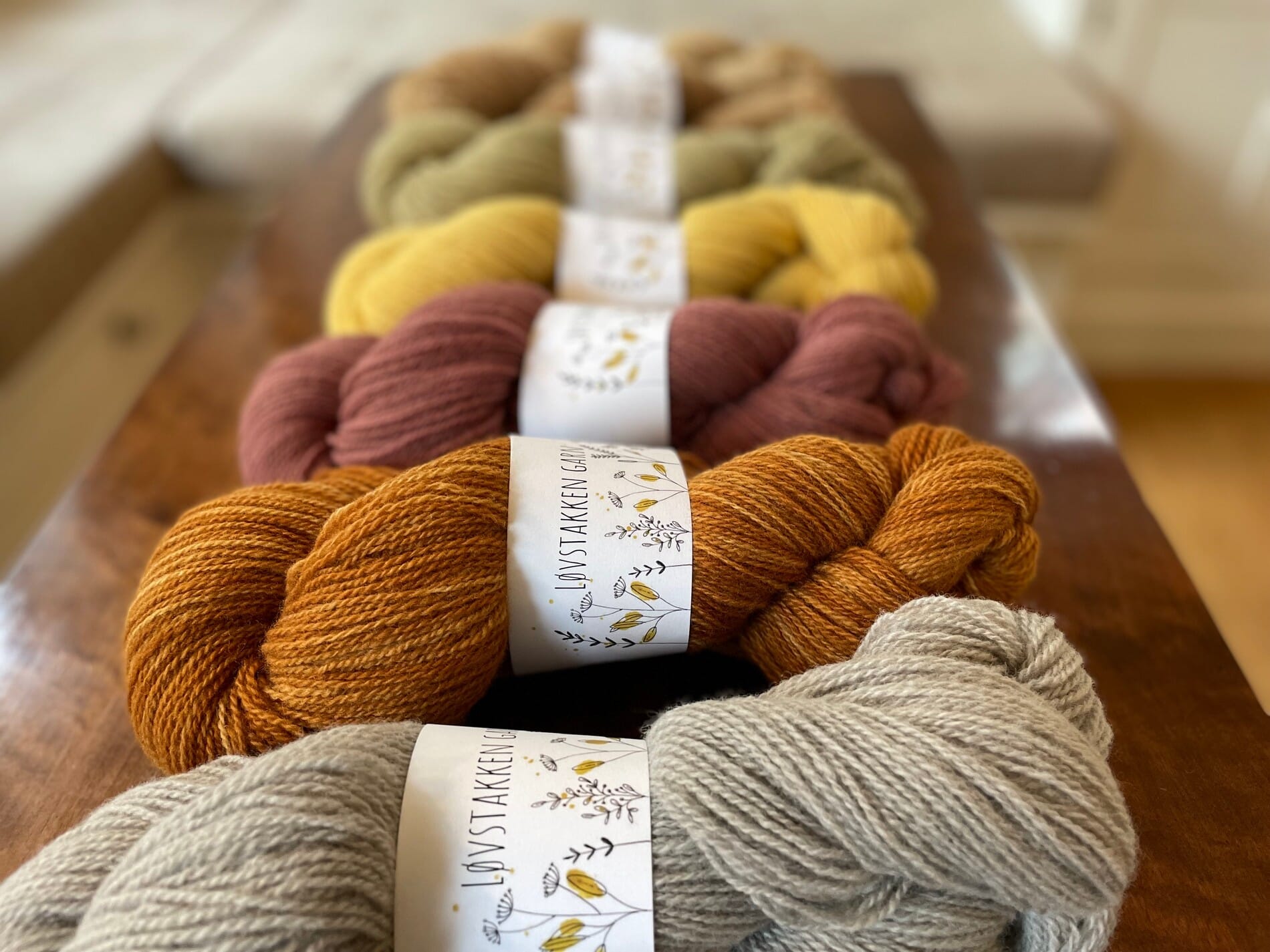 Navnet på fargene er den planten som har gitt farge til LØVSTAKKEN GARN. Plantene kan høstes fra vår til høst, lav og kjuker omtrent året rundt. Årets kolleksjon er fra planter sanket siste 12 måneder (høst 2020 tom sommer 2021). Ved å bruke norsk lammeull fra Hillsvåg, så er alt lokalprodusert, det liker jeg godt. Denne gangen har jeg farget på både naturhvit rågarn som i fjor, men nytt av året er at jeg også har farget på lys melert grå, og det har gitt en veldig fin dybde i fargen. For meg er det å farge med planter en form for terapi. Jeg får frisk luft og trim når jeg sanker, og under fargeprosessen er det gøy å se hvordan garnet skifter farge. Det er spennende for man vil aldri få samme farge hver gang.