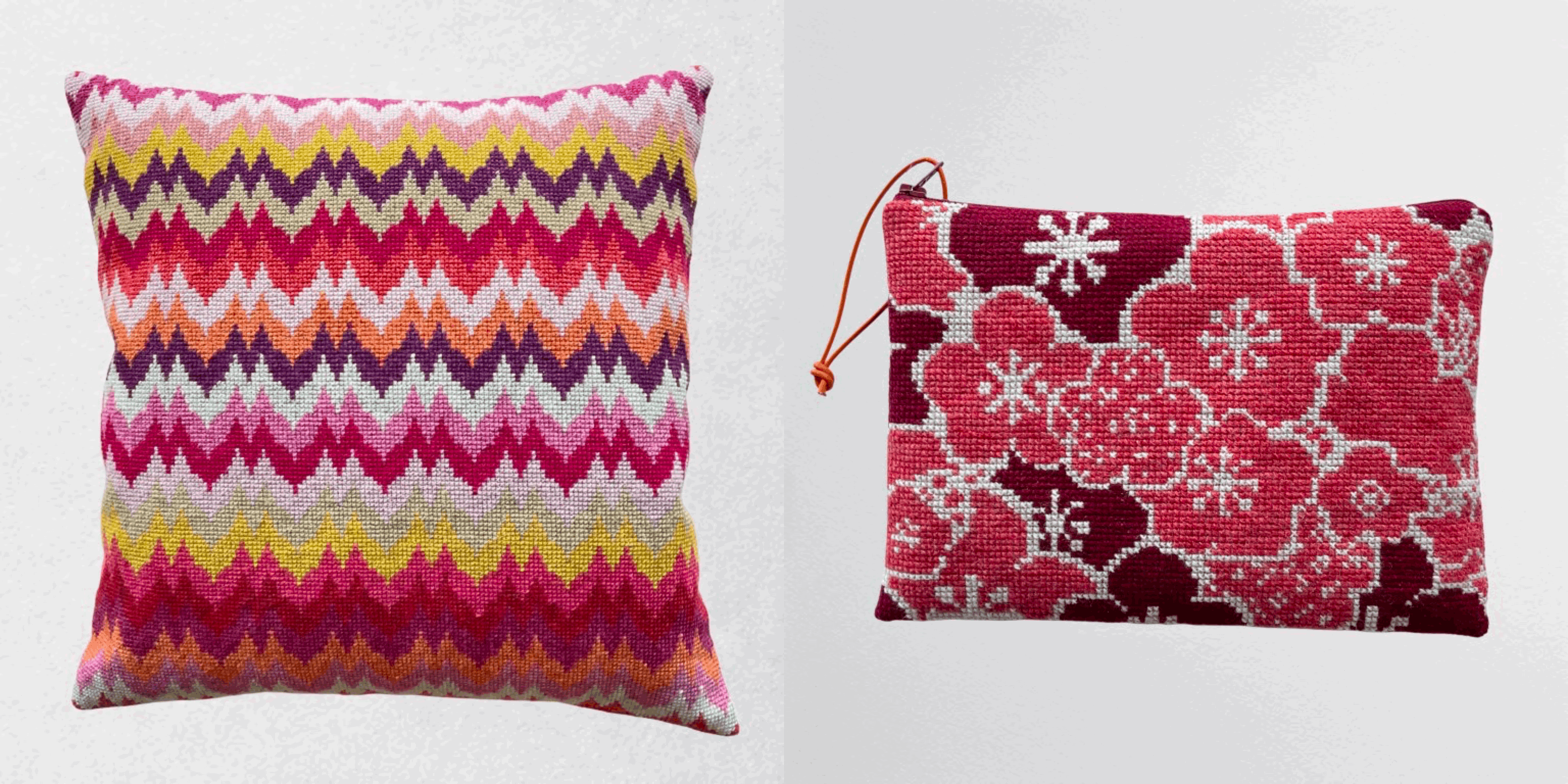 Baldyres siste kolleksjon av clutcher inneholder lekre farger og spennende design. Se til højre, se til venstre Clutch og Røde hunde Clutch er to morsomme og fine design med dyreverden i fokus, med henholdsvis lundefugl og hunder i korssting.