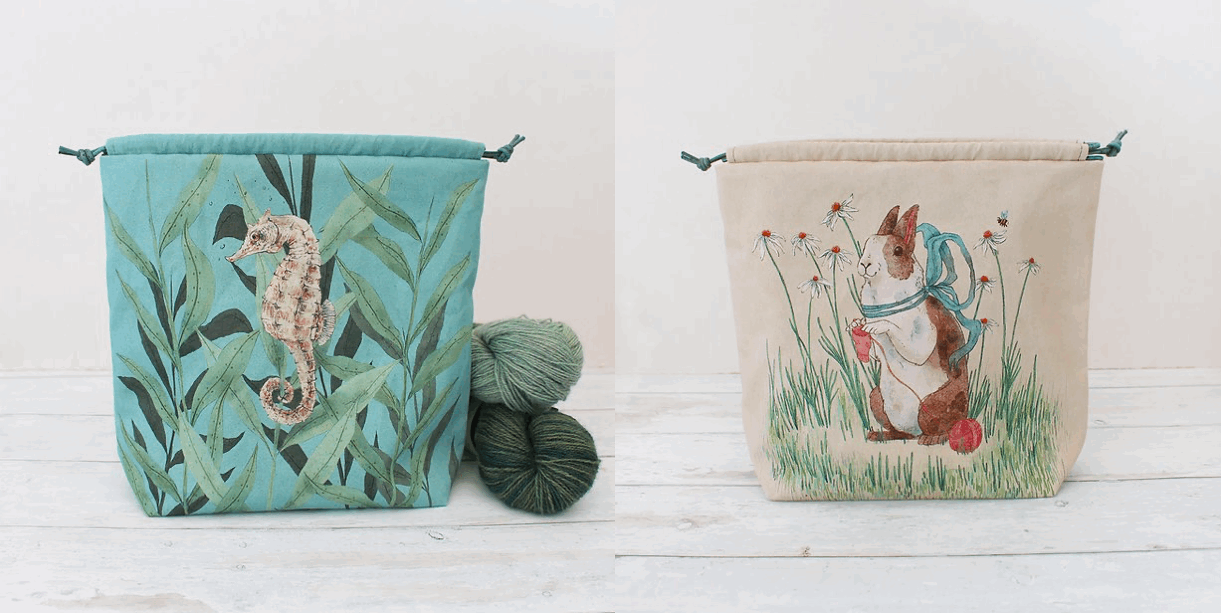 The Blue Rabbit House er et merke for blant annet nydelige prosjektposer til strikketøy. Designer og illustratør Eva Vercauteren bor i Antwerpen i Belgia. Å drive med håndarbeid og tegne har vært en viktig del av hennes daglige liv så lenge hun kan huske. Eva tegner motiv inspirert av naturens fauna og flora, og får det trykket på organisk bomullsstoff før hun så syr dem om til prosjektposer. Les mer om The Blue Rabbit House her!