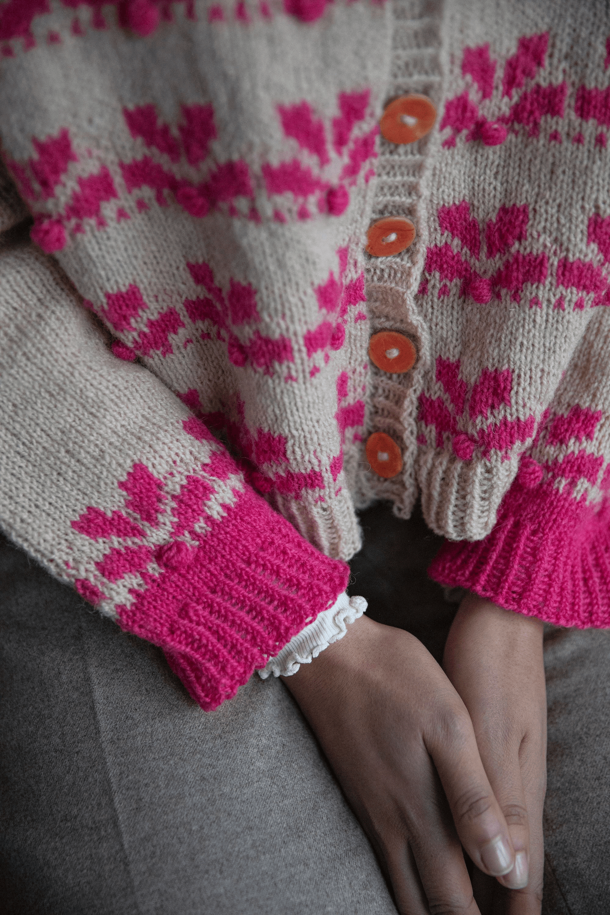 17 patterns: 7 sweaters, 5 cardigans, 2 pairs of socks, 1 cowl, 1 pair of mittens and 1 pair of fingerless mitts.
