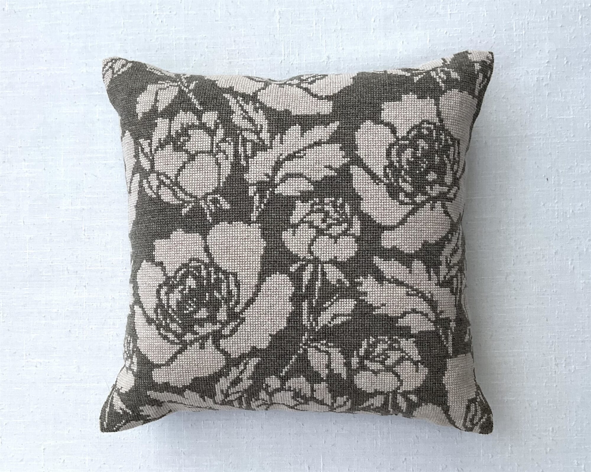 Baldyre Hvide Roser Pude Broderikit er et lekkert, grafisk rosemotiv brodert i fint ullgarn med en liten melering, som gjør motivet mer levende.