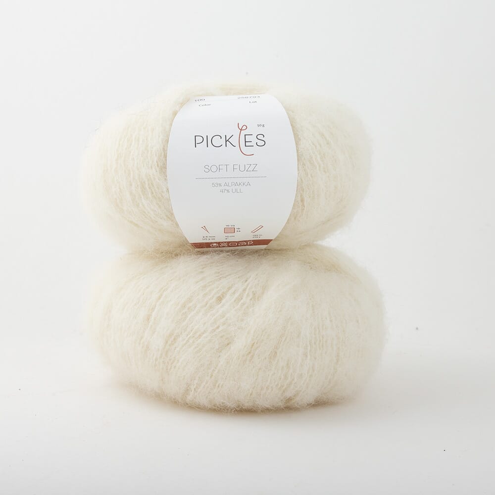 Garnet har en løpelengde på 195 meter på 50 gram, og strikkes på pinne nr. 3 - 6 mm. Pickles Soft Fuzz er et lett, tynt og usedvanlig drøyt garn i alpakka og ullblanding. Garnet er spunnet av én tråd, som er børstet og har en matt, myk og pusete finish.