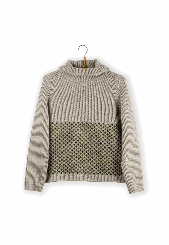 Modellen er overvejende strikket i drejet rib, som er inspireret af tiden, hvor modellen oprindelig er fra. Bærestykket er strikket i to tråde Highland Wool. Det flerfarvet mønster er forenklet og strikkes med to farver Spinni for et farvemix.