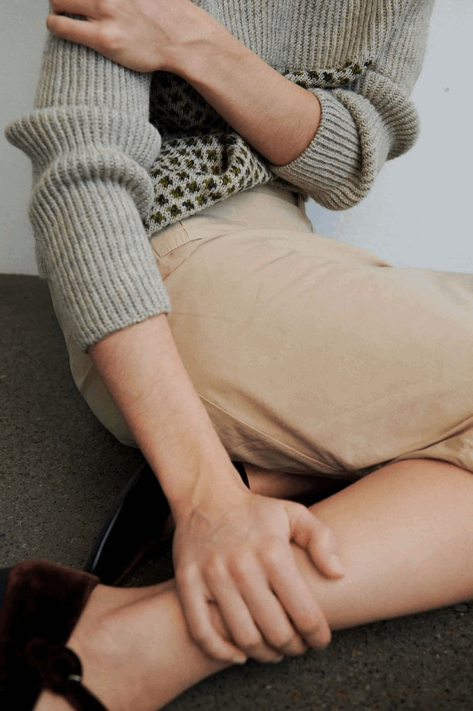 Agnes Sweater er strikket oppefra og ned og afsluttes forneden af en løs rib, som giver en fin pasform til modellen.