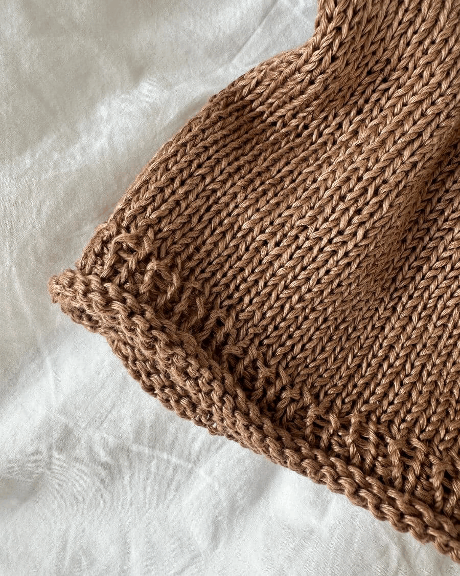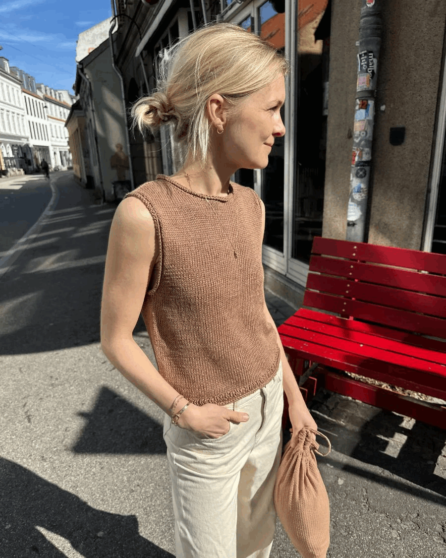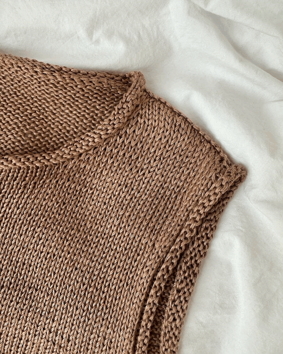 Den brune Cloud Top er strikket i Hør Organic fra Isager i fargen Camel.