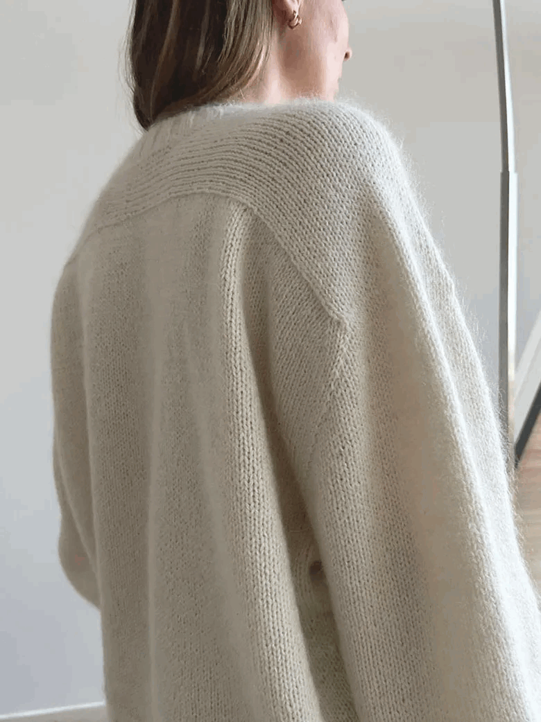 Heretter plukkes masker opp langs skuldrenes forkant og bakstykket. Deretter strikkes fortsatt frem og tilbake samtidig som det strikkes økninger til ermer og hals. Arbeidet samles ved å legge masker opp og bærestykket strikkes rundt på rundpinne. Heretter deles arbeidet og kropp og ermer strikkes rundt hver for seg og avsluttes med kanter i 2×2 vrangbord. Til sist samles halskantens masker opp og strikkes rundt i 2×2 vrangbord, vrangbordkanten avsluttes med tubular italiensk avfelling.