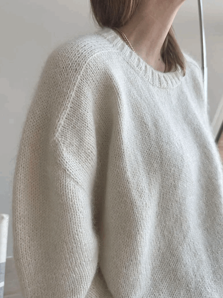 Sweateren strikkes oppefra og ned i et stykke og er monteringsfri. Først legges masker opp midt bak i nakken, heretter strikkes frem og tilbake, først over venstre- og deretter over høyre skulder.