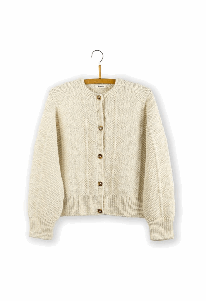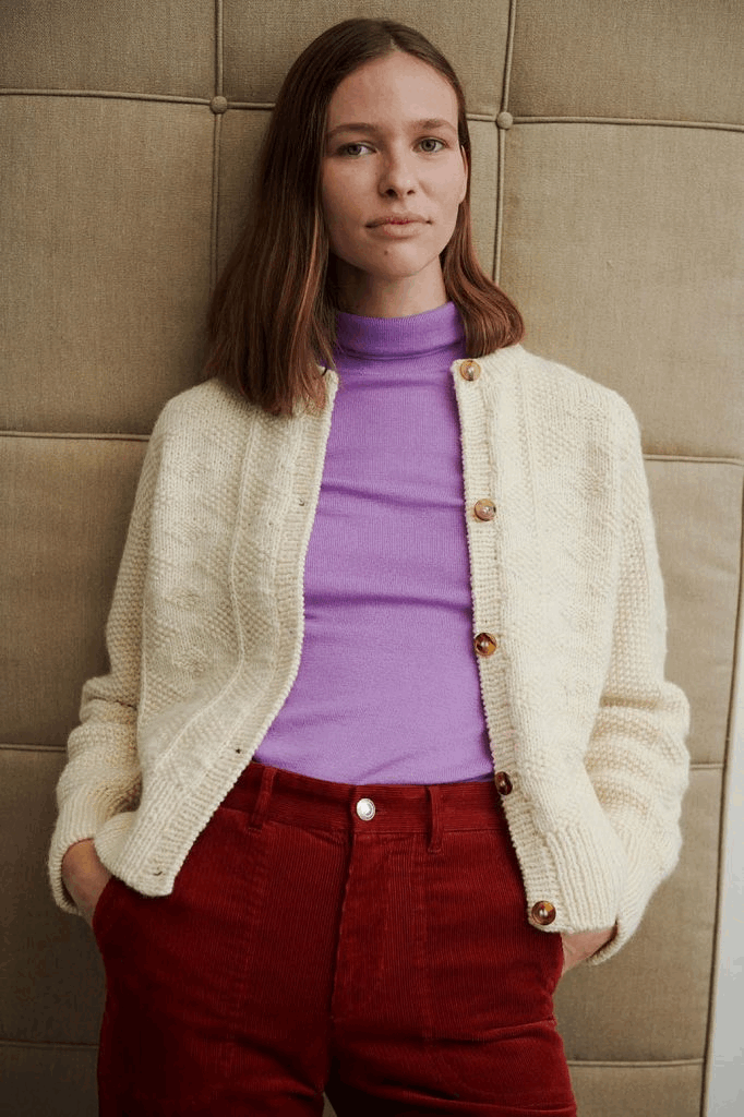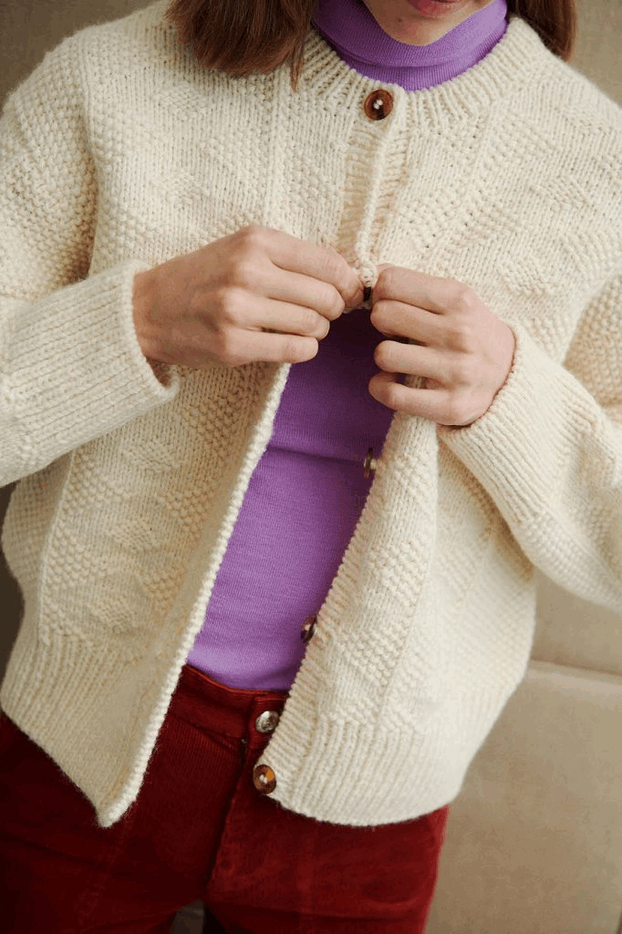 Da jeg fik lov at se mig omkring i Isagers arkiv af tidligere opskrifter, var jeg ikke i tvivl, da jeg så cardiganen, der er inspiration for Esther Jacket. Det simple men meget effektfulde mønster af ret- og vrangmasker har en tidløs kvalitet over sig, og det er sådan en strik, man ville elske at finde i sin bedstefars skab og tage med hjem i sit eget. Esther Jacket strikkes oppefra og ned i Jensen Yarn og Highland fra Isager Yarn.