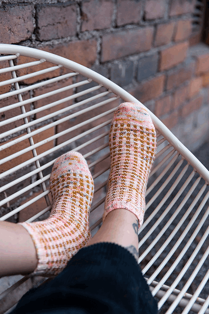 Du kan valgfritt endre farger selv, og legge til pinner. Norsk oversettelse ettersendes digitalt som PDF-fil. Oppskriften finnes også i boken 52 Weeks of Socks, VOL. II. Dersom du ønsker oppskriften i papirform må du kjøpe boken. Du kan legge den til i bestillingen under «Vil du kjøpe hele strikkeboken?».