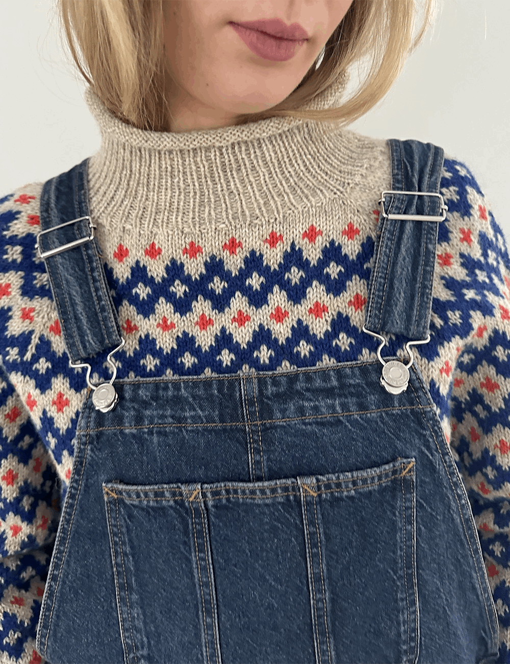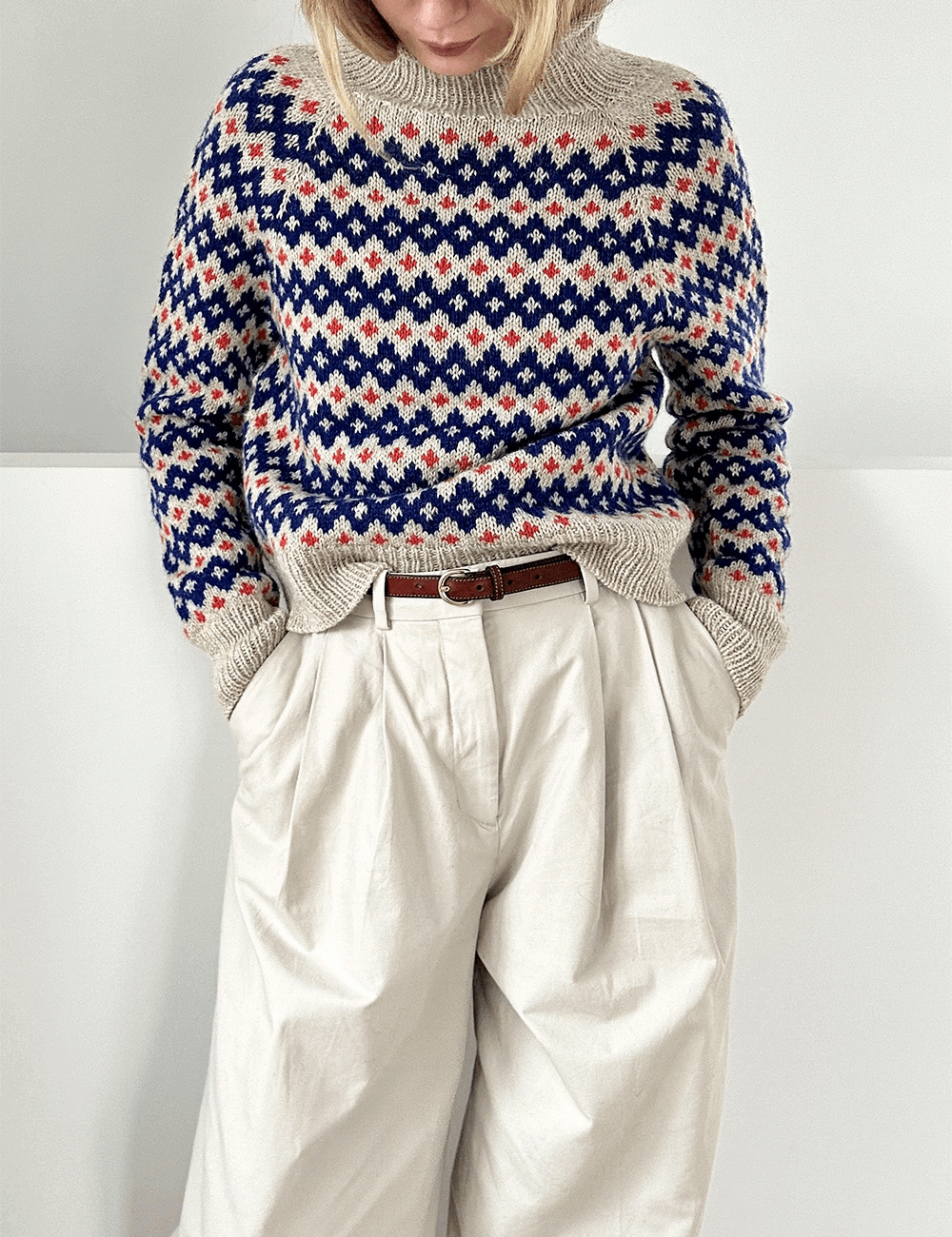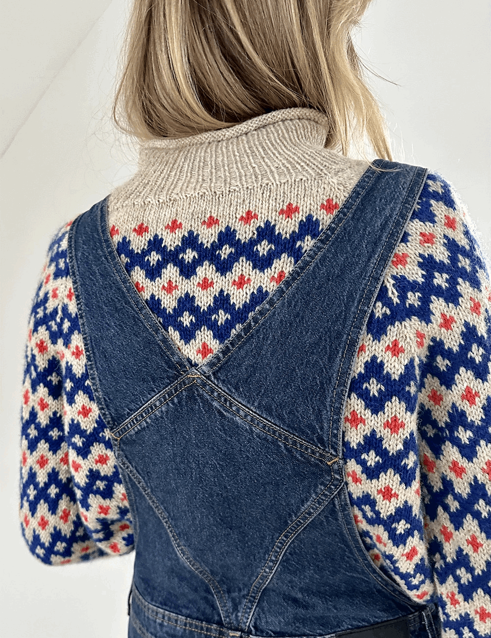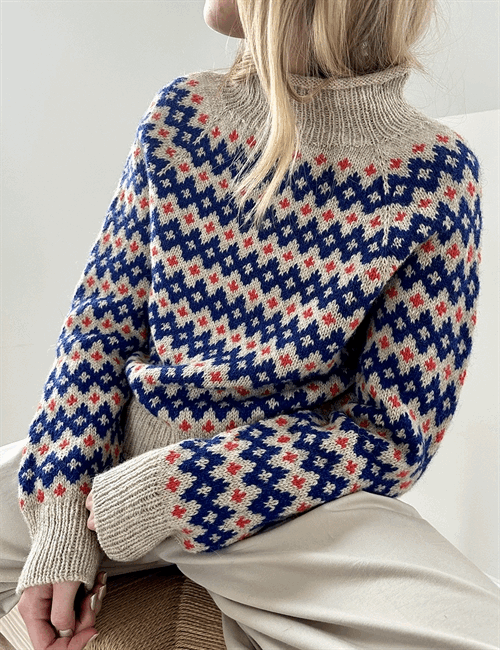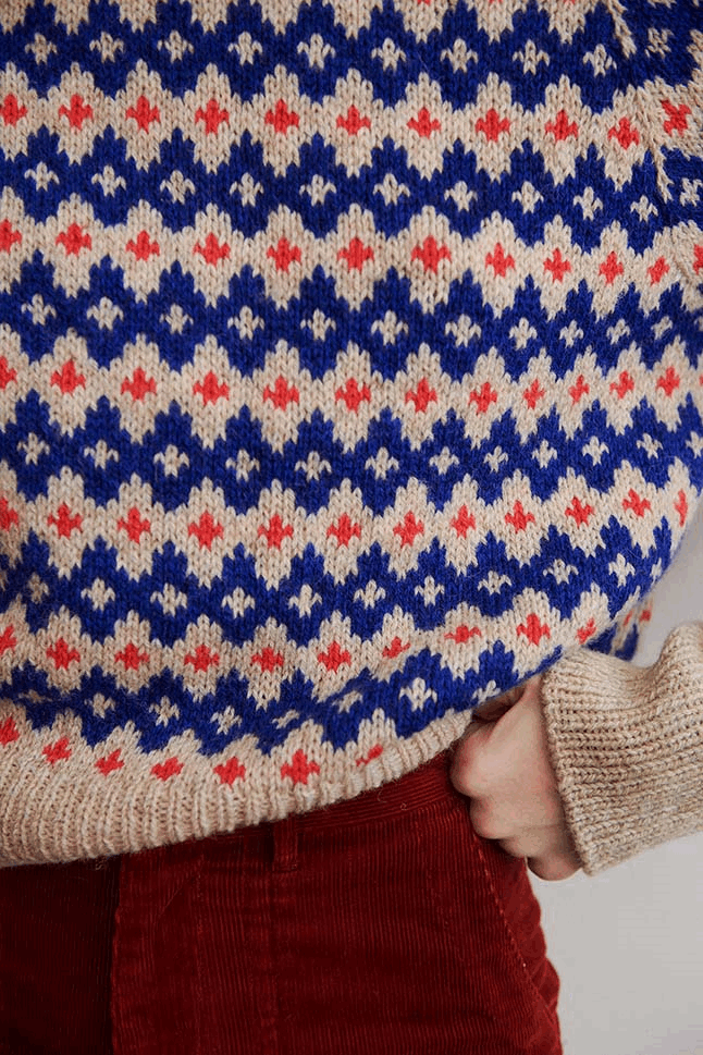Inge Sweater har tydelig reference til 60ernes og 70ernes mønstre og formsprog - men også til endnu tidligere mønstertradition. Det gør Inge Sweater til en moderne klassiker, der er nem at sætte sit eget præg på i kraft af de farver, man strikker den i.