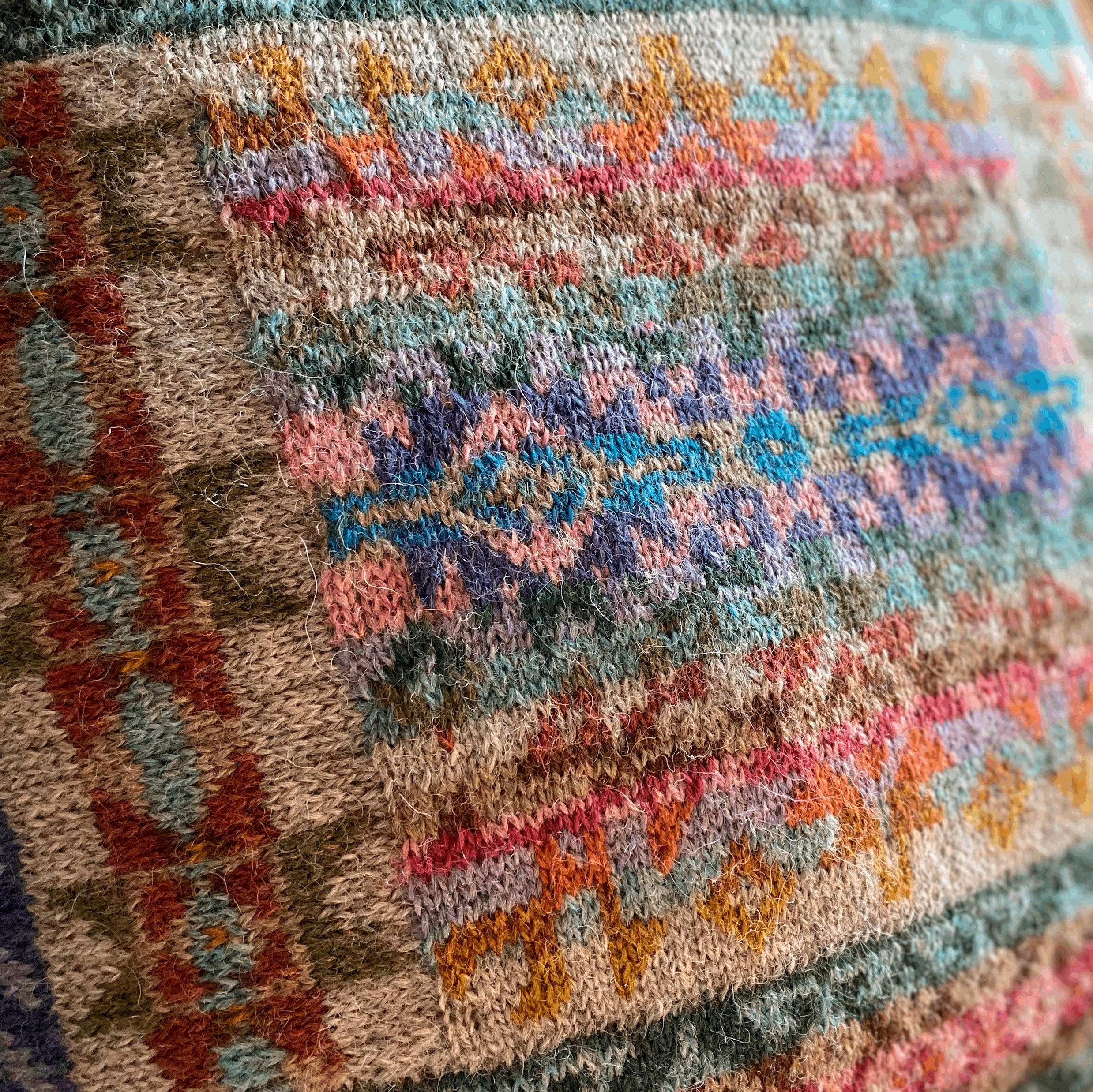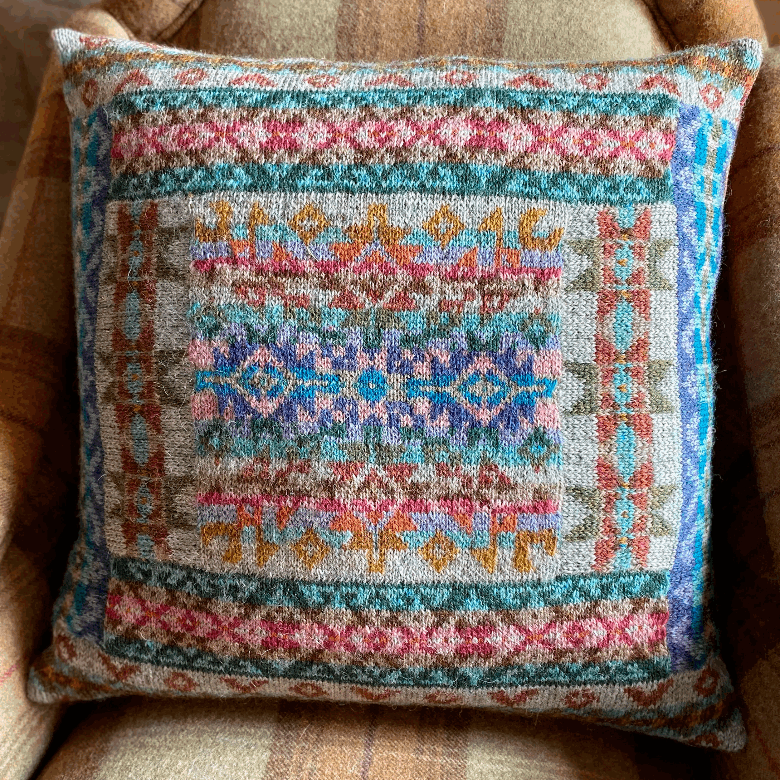 Kilim-puten er et vakkert design inspirert av Maries kjærlighet til tepper og kilimer fra Midtøsten. Dette designet strikkes flatt, hvor du starter med den midterste firkanten og deretter strikkes alle andre seksjoner i hverandre i en "log cabin"-effekt.