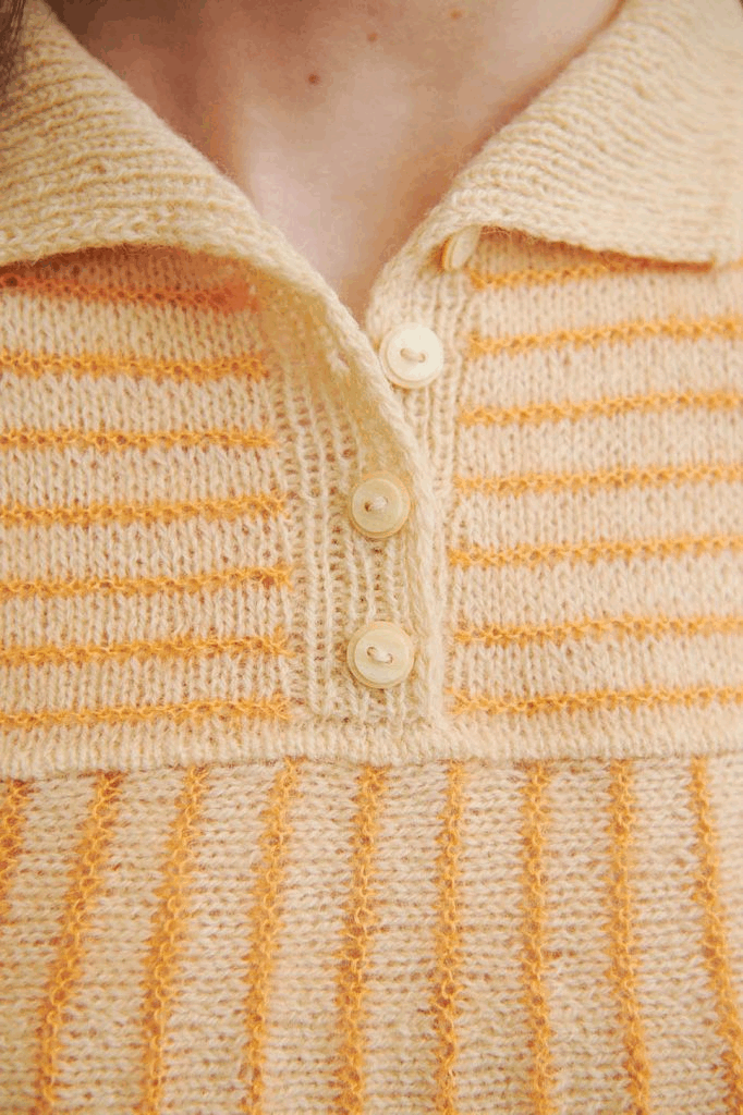 Modellen har ribkrave og små kuppelærmer, som strikkes for sig og sys på.