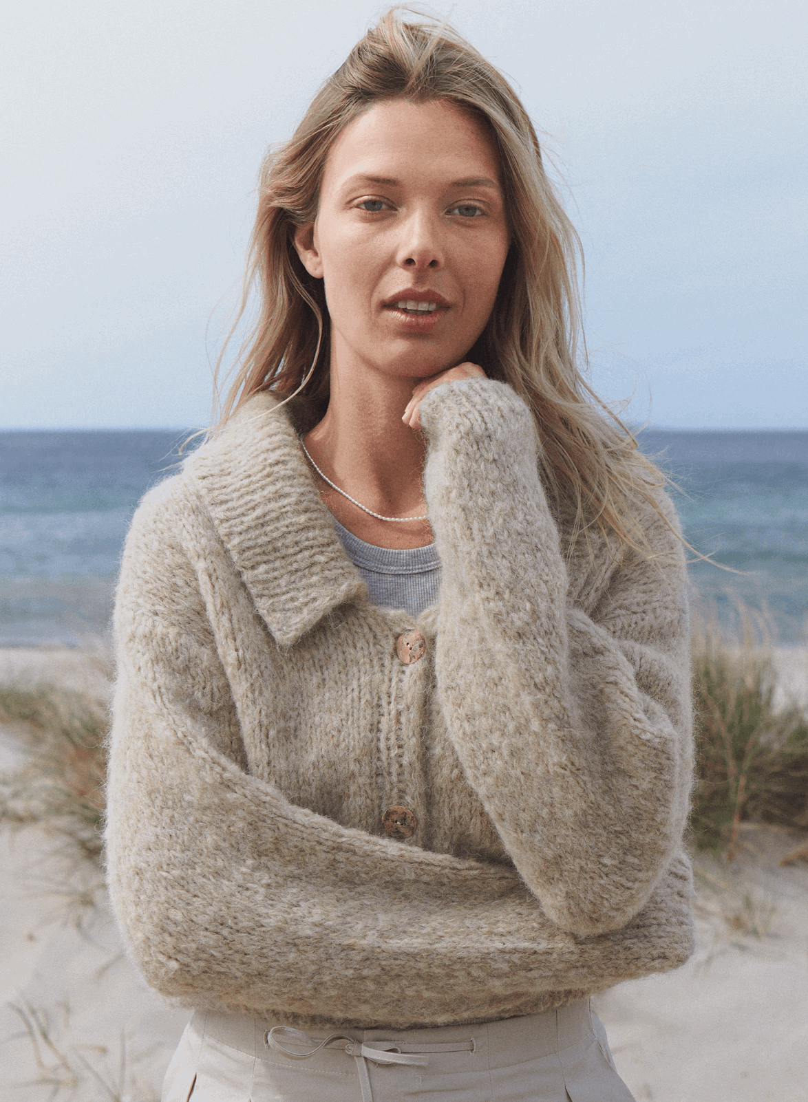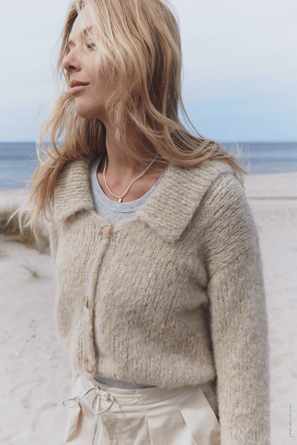 Strikkefasthet: 12 m og 17 p/omg glattstrikk med to tråder på p 6,5 mm = 10 x 10 cm. 15 m og 22 p/omg vrangbord på p 4,5 mm = 10 x 10 cm