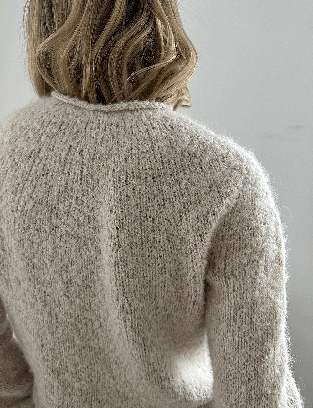 Plain Yoke Sweater er en begynnervennlig genser med rundt bærestykke. Den strikkes av en tråd luftig bouclégarn og en tråd tynn ull. Er du helt nybegynner kan du eventuelt sløyfe vendepinnene i nakken, slik at du bare skal strikke rundt. Følg da oppskriften til debutantversionen, som strikkes utelukkende med rette masker. Detailed Edition har vendepinner i nakken som strikkes etter halskanten, men utover det er utgavene helt like.