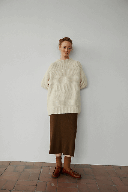 For- og bakstykket strikkes hver for seg, nedenfra og opp. Ermene strikkes fra håndledd til skulder. Det samles opp masker til halskant på forstykket, som sammen med de resterende ermemaskene og nakkemaskene strikkes rundt til halskant. Til slutt sys genseren sammen med madrassting.