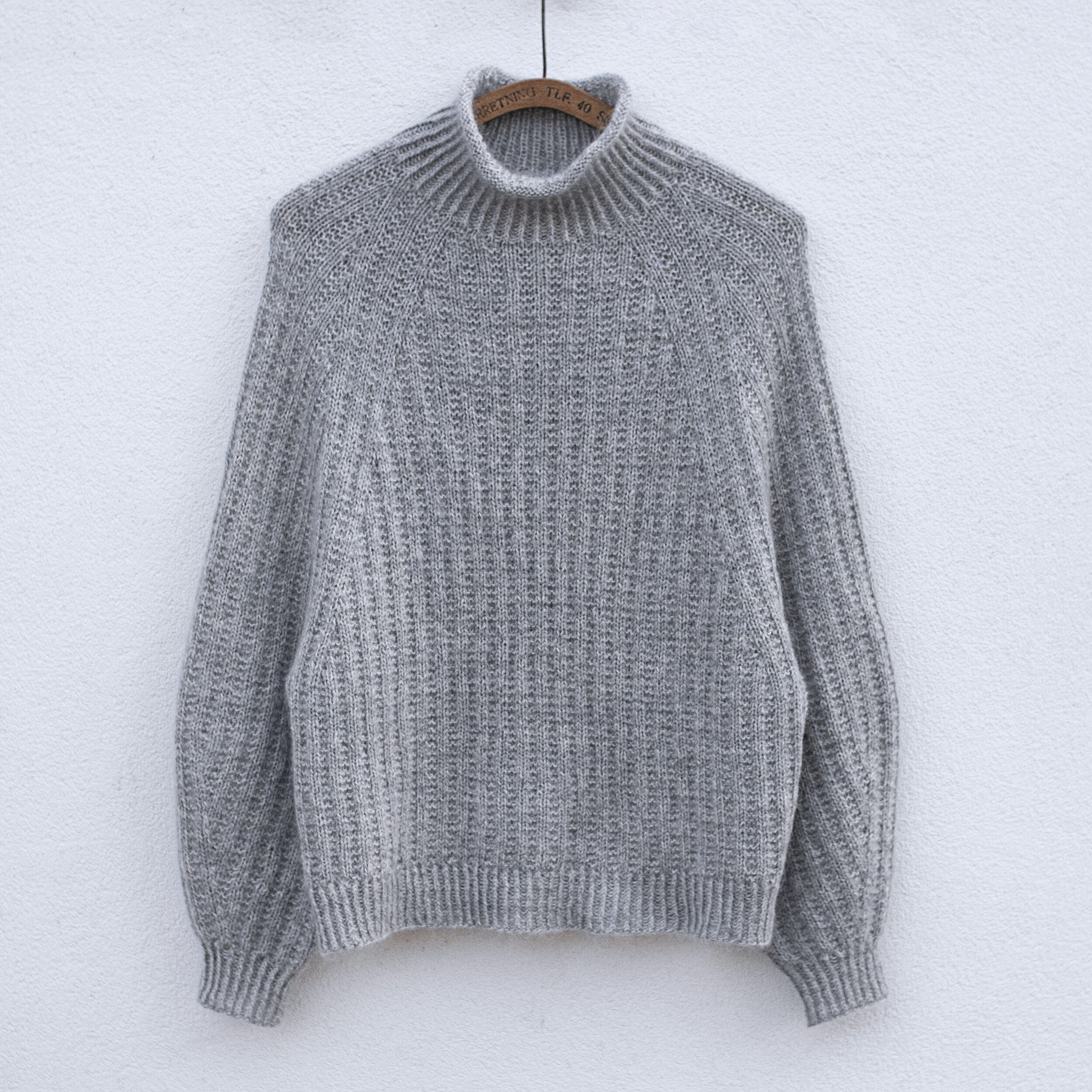 Ribbed Jumper er en deilig genser med et dypt og elegant raglansnitt. Detaljene er i en vridd ribb, med en myk rullekant rundt halsen, og elegante fellinger langs ermets ytterside. Genseren strikkes ovenfra og ned. Først strikkes halskanten, deretter strikkes det vendepinner for at gjøre genseren lengre bak. Så strikkes resten av genseren rundt, hele veien ned over bærestykke, bol og ermer.