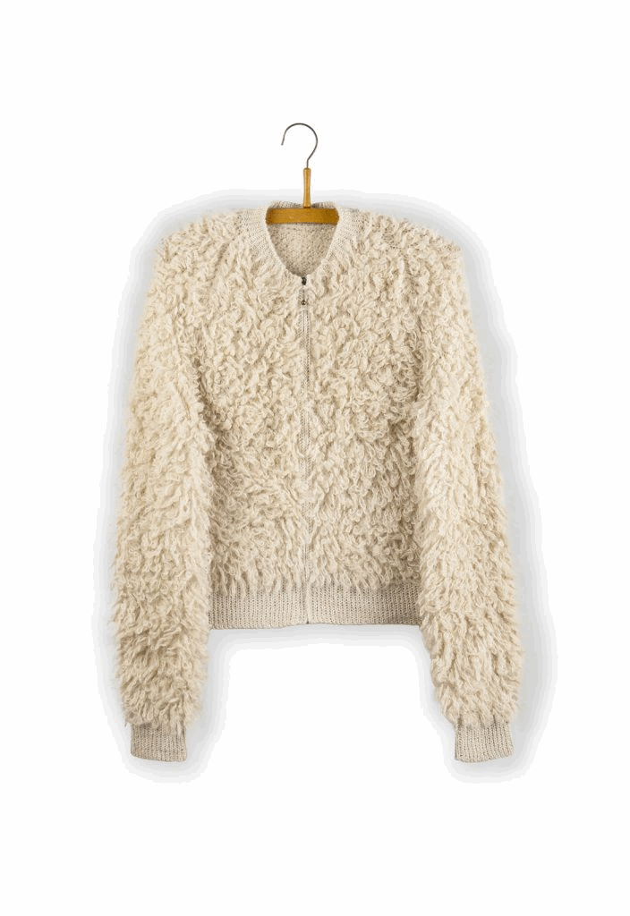 Jeg har nyfortolket jakken i en let udgave af en bomber jakke, hvor løkkerne er strikket i Isager Bouclé, som jeg synes er skabt til jakken. De fine små løkker i garnet giver løkkerne prikken over i’et, næsten som en pels.
