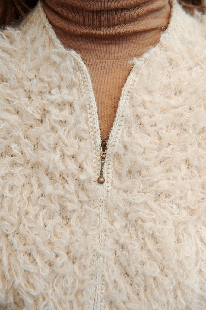 Jeg har nyfortolket jakken i en let udgave af en bomber jakke, hvor løkkerne er strikket i Isager Bouclé, som jeg synes er skabt til jakken. De fine små løkker i garnet giver løkkerne prikken over i’et, næsten som en pels.