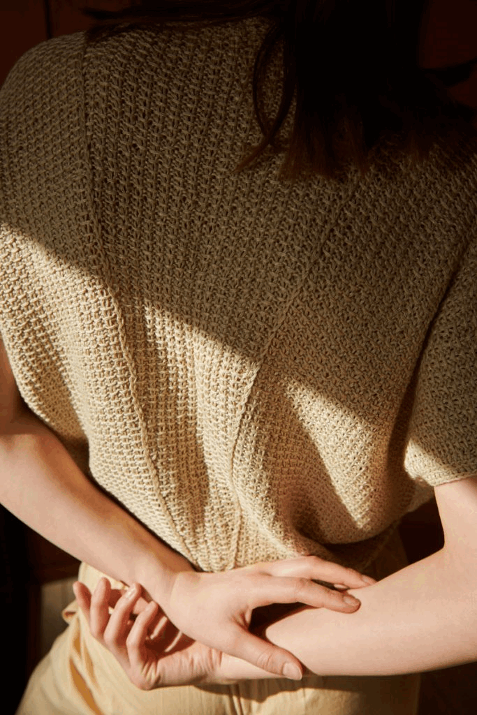 Modellen strikkes nedefra og op, hvor jeg med hjælp af vendepinde skubber mønsteret i hver sin retning. Det skaber en ren linje langs forkanten på forstykket, og på ryggen bliver midterstykket som en kile, der giver ryggen et spændende udtryk.