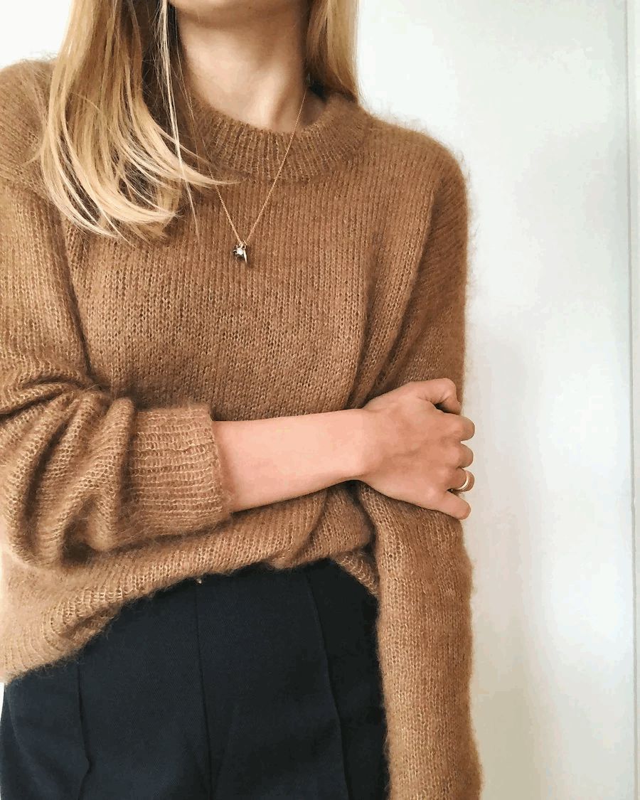 Stockholm Sweater strikkes ovenfra og ned i glattstrikk i dobbel tråd silk/mohair. Først strikkes øverste del av ryggen, og deretter plukkes det opp masker til skuldrene langs ryggens oppleggskant. Skuldrene strikkes hver for seg med forkortede pinner (vendepinner), slik at det dannes en kile. For- og bakstykker samles under ermehullet, og bolen strikkes rundt på rundpinne. Langs armåpningene plukkes det opp masker til ermer som strikkes rundt på strømpepinner eller med Magic Loop. Til slutt plukkes masker opp langs halsåpningen, hvor det strikkes en vrangbordkant som brettes til slutt og sys fast på vrangsiden. Stockholm Sweater er monteringsfri, med unntak av halskantens brettekant.