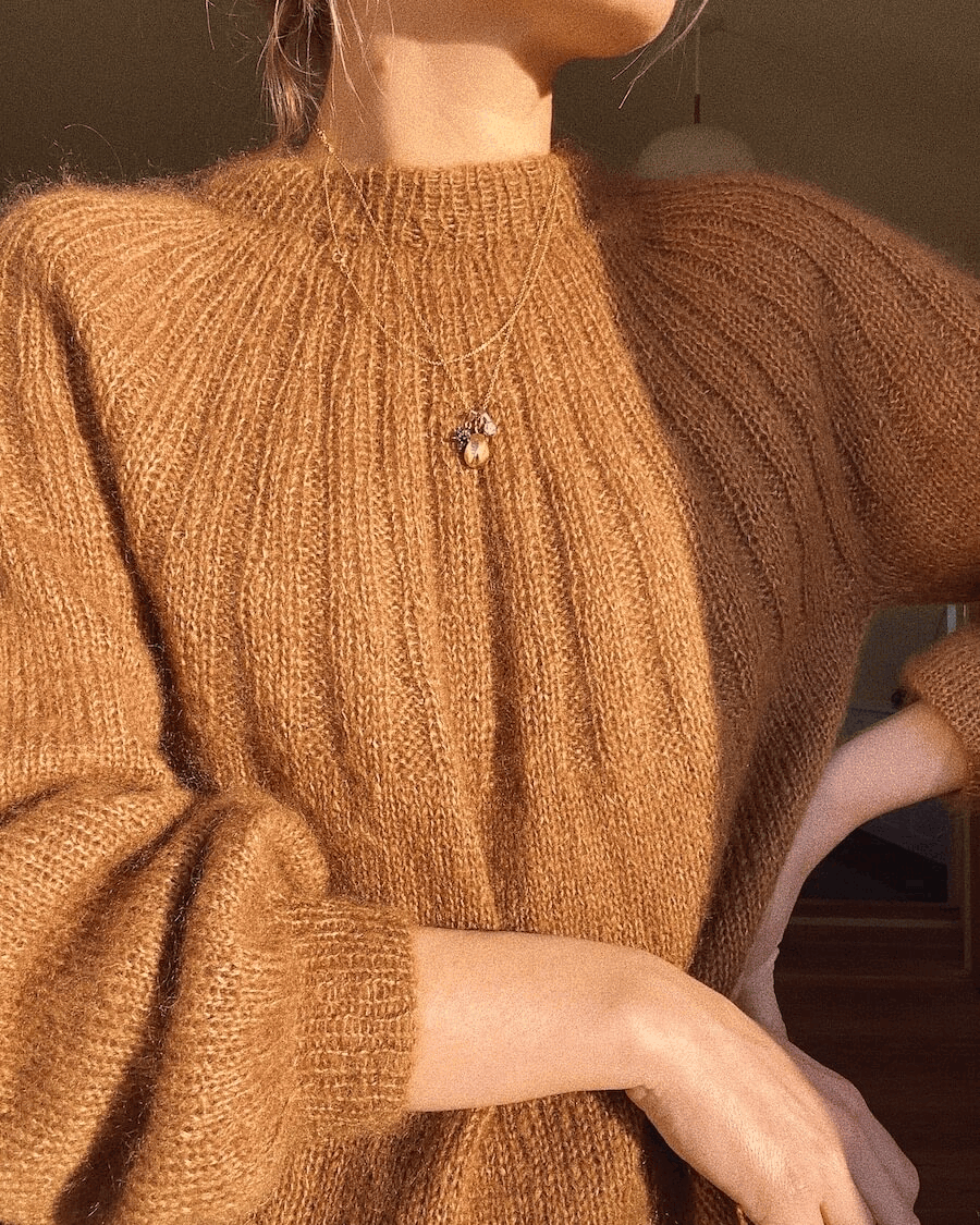 Sunday Sweater – Mohair Edition strikkes ovenfra og ned. Halskanten strikkes i vrangbord og brettes. Bærestykket strikkes rundt i ribb med økninger. Bol og ermer strikkes i glattstrikk og avsluttes begge med en vrangbordkant. Sunday Sweater – Mohair Edition er monteringsfri.