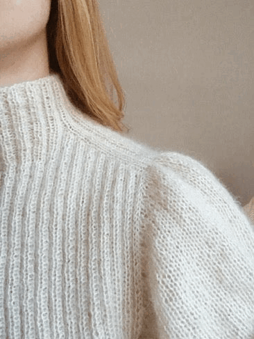 Kroppen er strikket i dobbeltribb mens de voluminøse puffermene er i glattstrikk. Den er tenkt kort i modellen, men siden den strikkes ovenfra og ned, har du mulighet for å prøve den underveis og velge den lengden som passer deg.