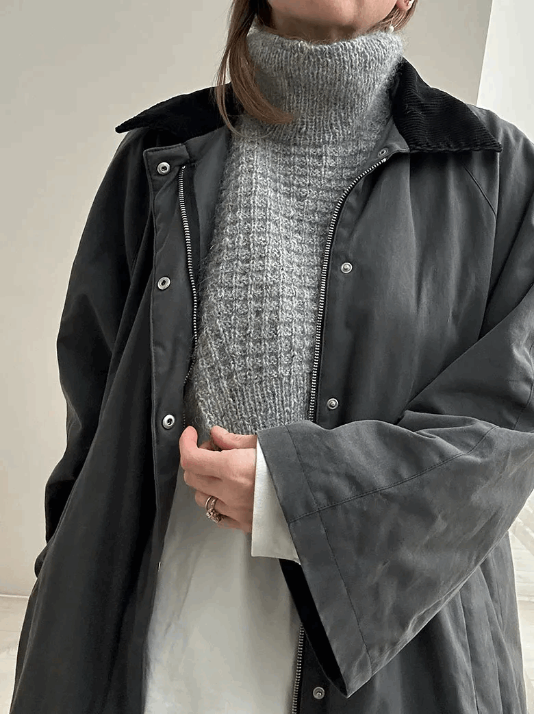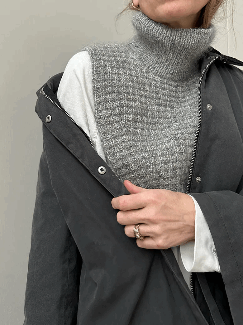 Den grå utgaven er vist i Isager Tweed farge Winter grey sammen med Silk Mohair farge 3s.