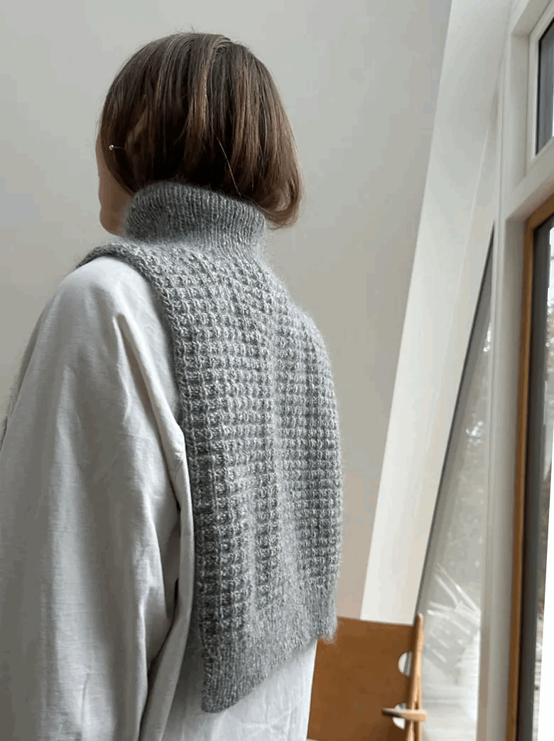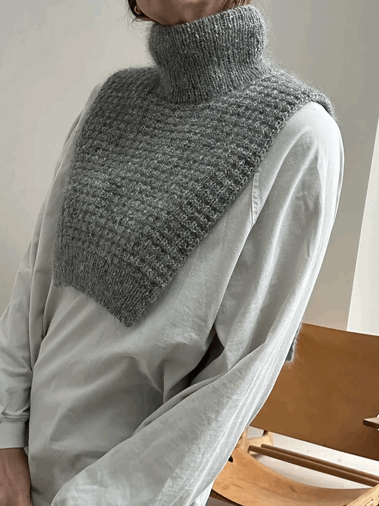 WAFFLE_LOOP_NECKWARMER strikkes nedenfra og opp fra nederst på bakstykket, over skuldrene og ned over forstykket. Først legger du opp masker med italiensk opplegg nederst på bakstykket. Deretter strikker du først frem og tilbake i ribb, og så i vaffelstruktur. Skuldrene strikker du frem og tilbake, hver for seg, samtidig med at du øker til halsåpningen. Begge skuldrene settes sammen til forstykke ved å legge opp nye masker foran. Så strikker du forstykket frem og tilbake i vaffelstruktur, og feller inn i begge sider for å forme trapesformen på forstykket. Forstykket avsluttes med en ribbkant og felles av med italiensk avfelling. Til sist strikker du opp masker til halskanten, som strikkes rundt i ribb. Ribbkanten avsluttes også med italiensk avfelling.