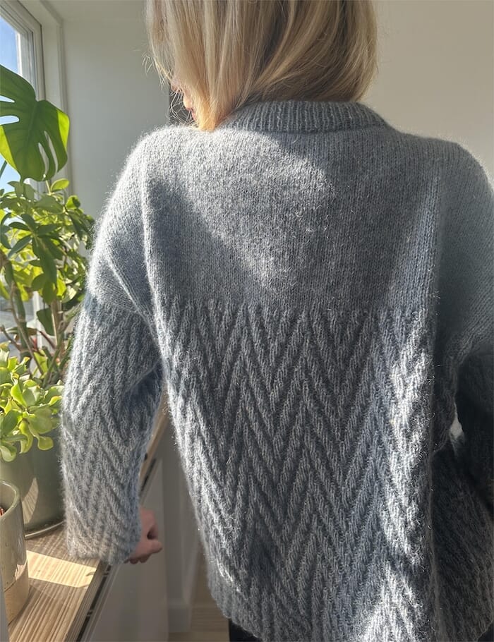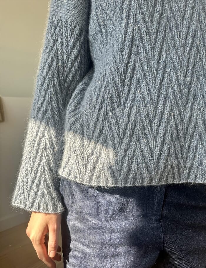 Woodlark sweater har et enkelt mønster i rett og vrang på bol og ermer. Mønsteret lager en fin kontrast til overdelen i glattstrikk. Genseren strikkes ovenfra og mønsteret danner en kant i seg selv, noe som gir en fin avslutning, men også gjør det ekstra enkelt å regulere lengden på bol og ermer.