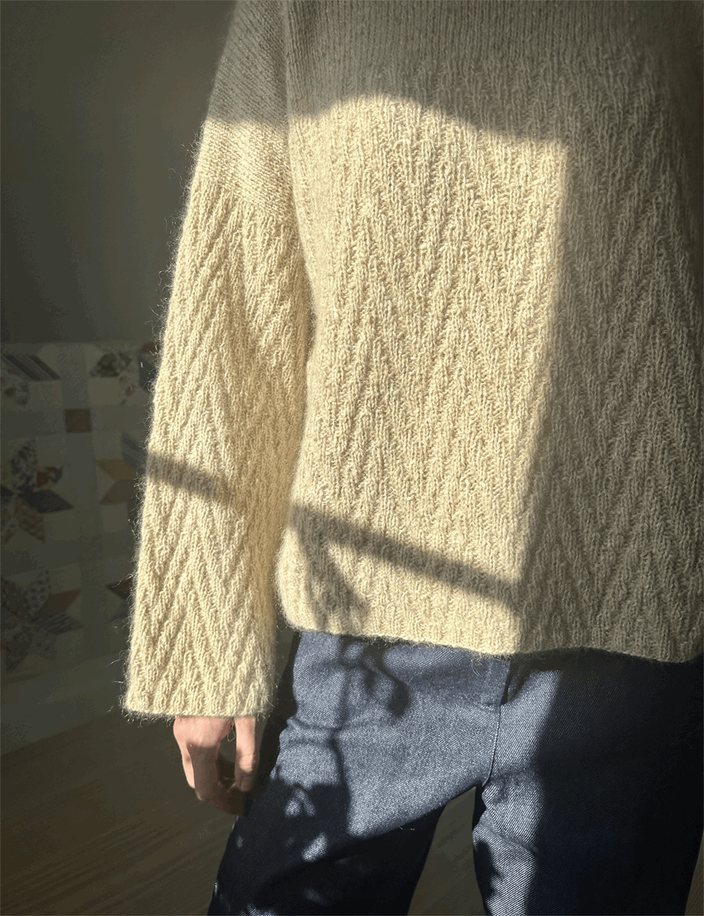 Merk, lys og blå genser: Alt strikkes med 2 tråder garn, 1 tråd i hver kvalitet.