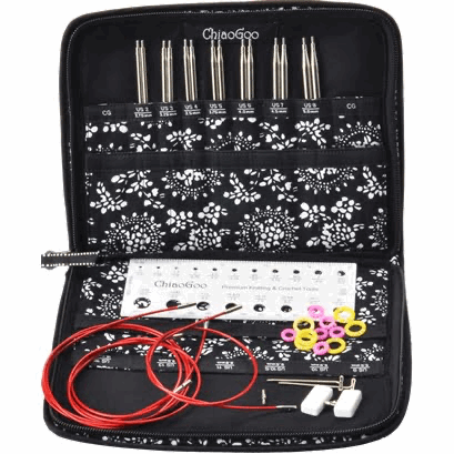 TWIST er navnet på settene med utskiftbare pinnespisser. TWIST Rundpinnesett Complete 13 cm (2,75-10 mm)inneholder pinnespisser i 13 cm og inkluderer pinnespisser fra 2,75 mm til 10 mm, med unntak av 3 mm og 7 mm. Settet inkluderer pinnespisser i rustfritt stål i kirurgisk kvalitet, og røde, nylonbelagte flertrådede stålkabler. TWIST-kabler er minnefrie, det vil si at de ikke krøller – og de har livlinehull. De er også brukervennlige for strikkere som er følsomme for nikkel. Koblinger, endestoppere, T-formede strammenøkler, maskemarkører, en pinnemåler og en solid oppbevaringsmappe er inkludert i settet.