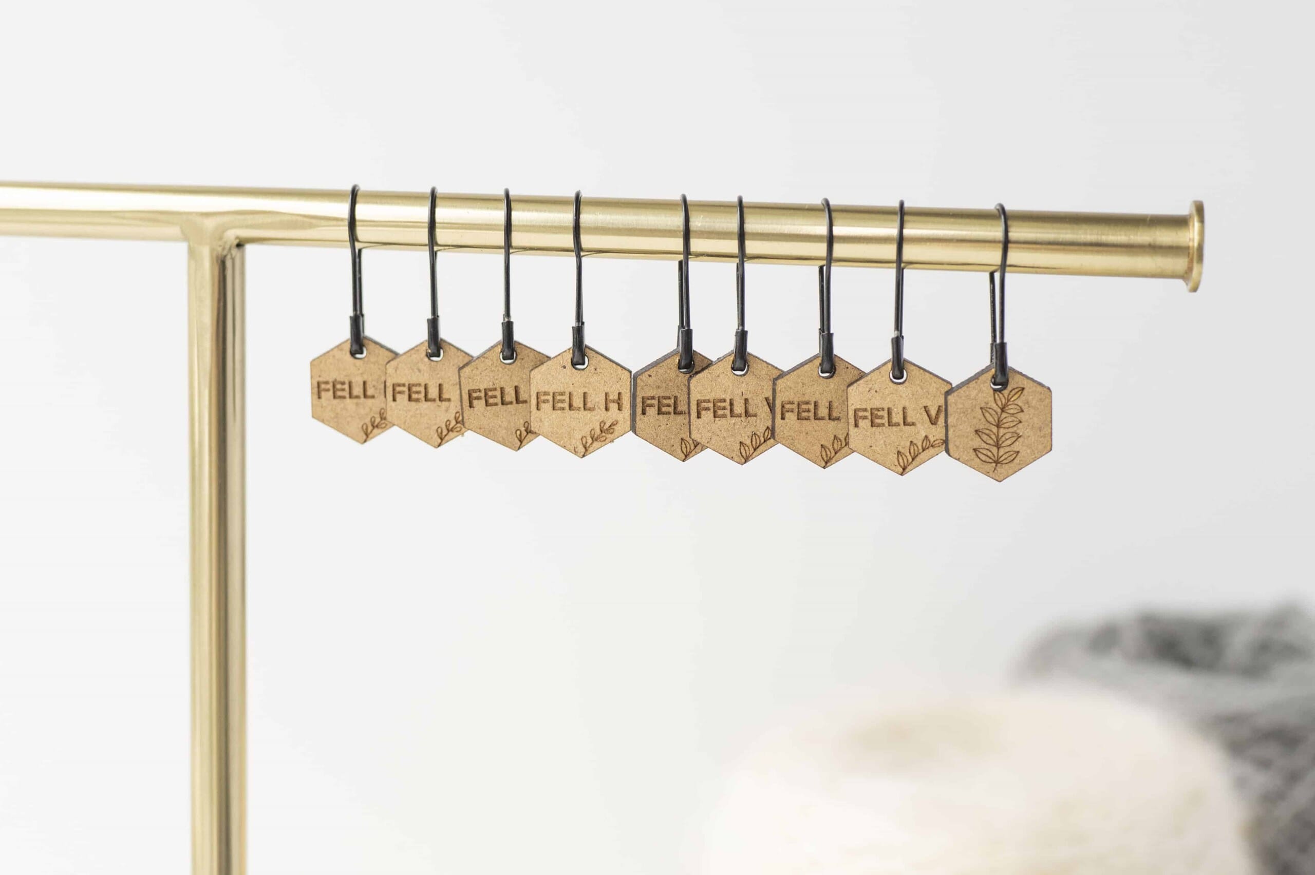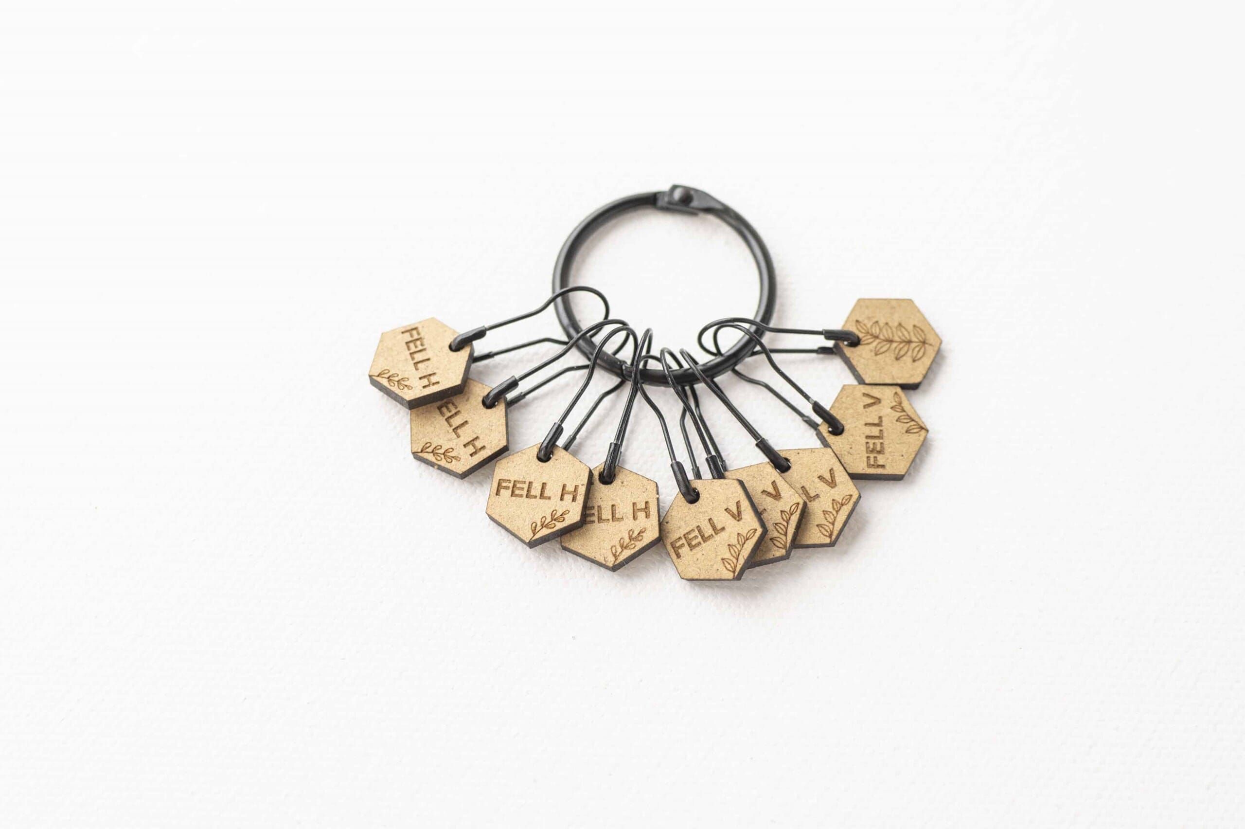 Maskemarkørene henger på en svart sikkerhetsnål som kan hektes på pinnen eller i arbeidet.