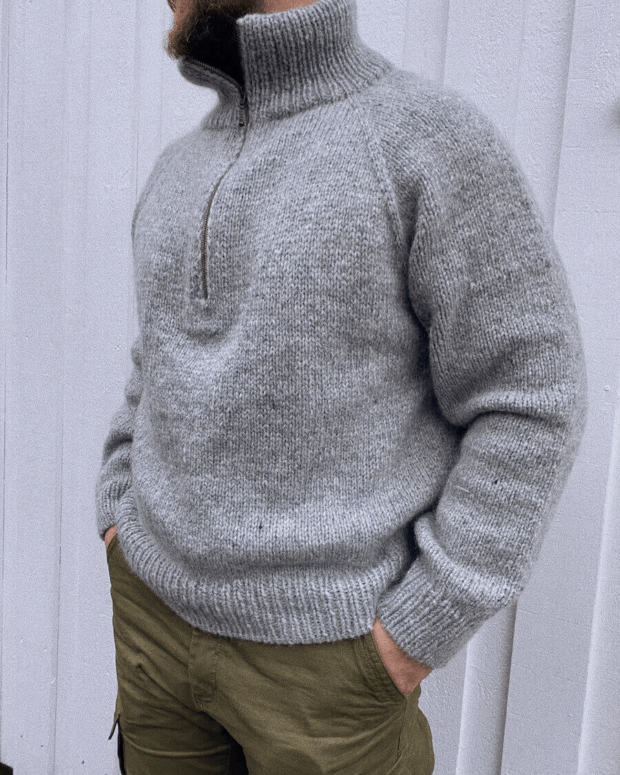 Den grå Zipper Sweater - Man er strikket i Fritidsgarn fra Sandnes Garn i fargen Gråmelert [1042].
