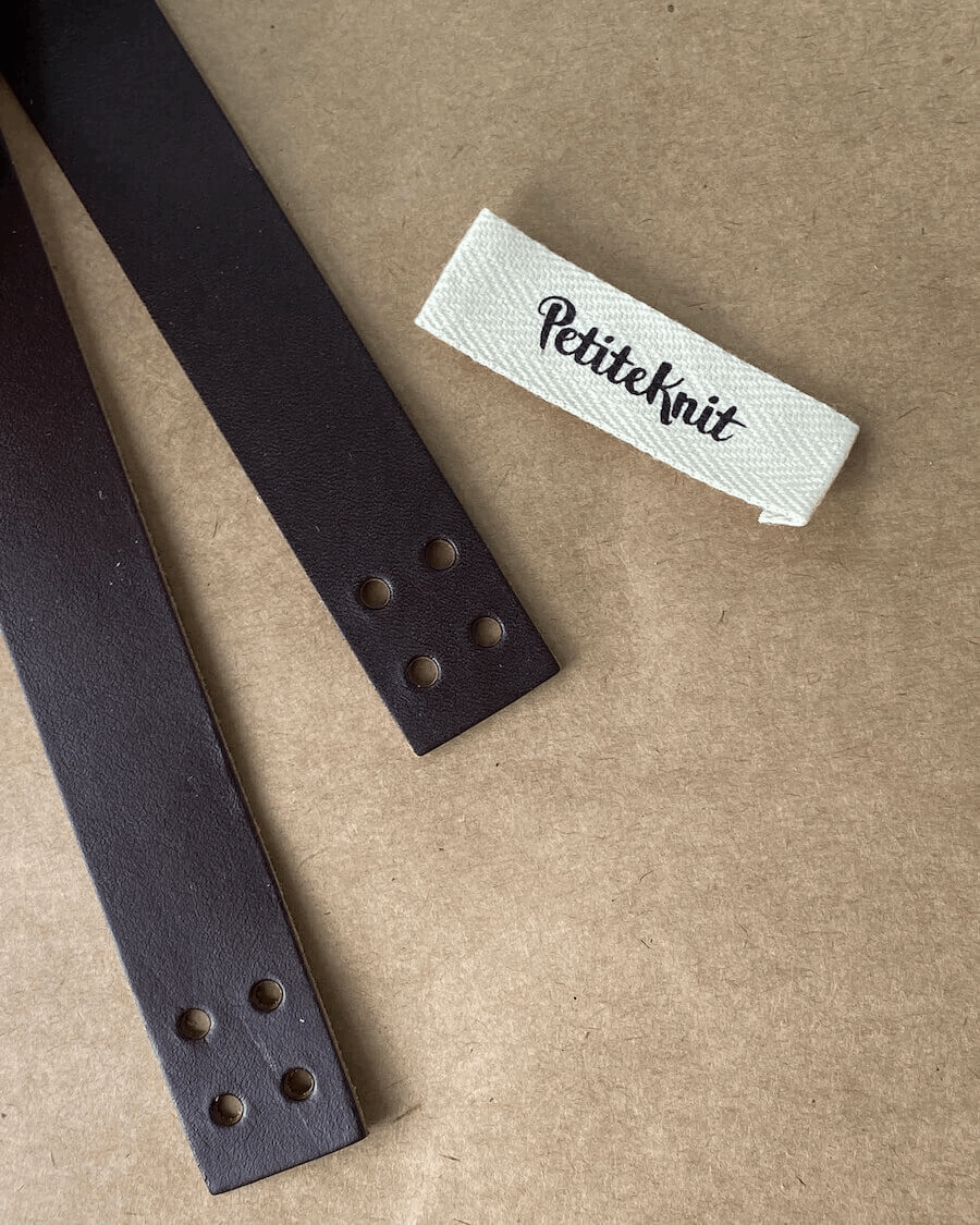 Hver pakke inneholder 2 stropper som hver har 4 hull i hver ende til påsying, samt en PetiteKnit-label.
