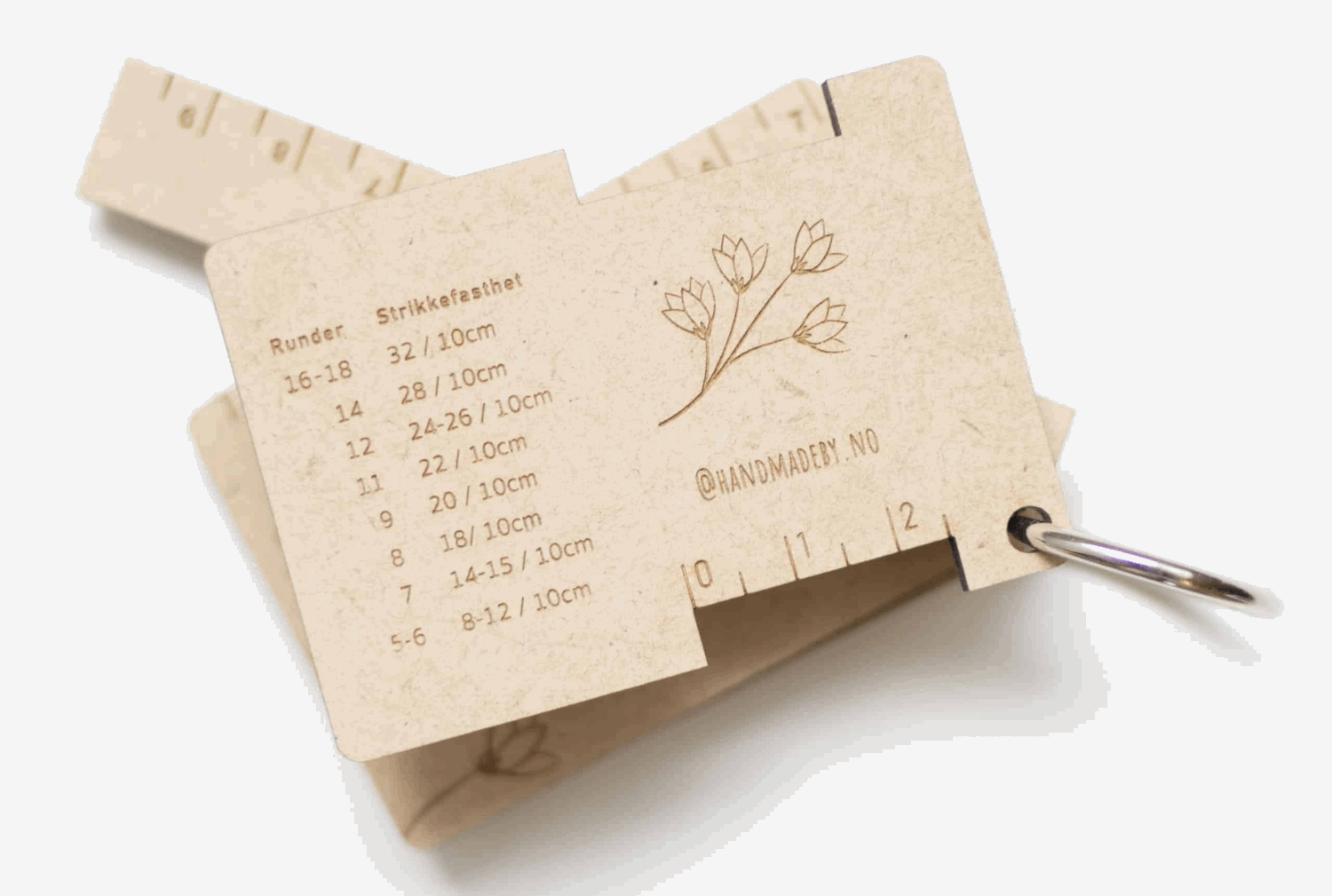 Alle strikkemålerne er laserkuttet og håndpusset. De er laget av naturmateriale som gjør at fargeforskjeller, svakheter og ujevntheter kan forekomme. Produsert og designet av Handmade by_ i Norge.