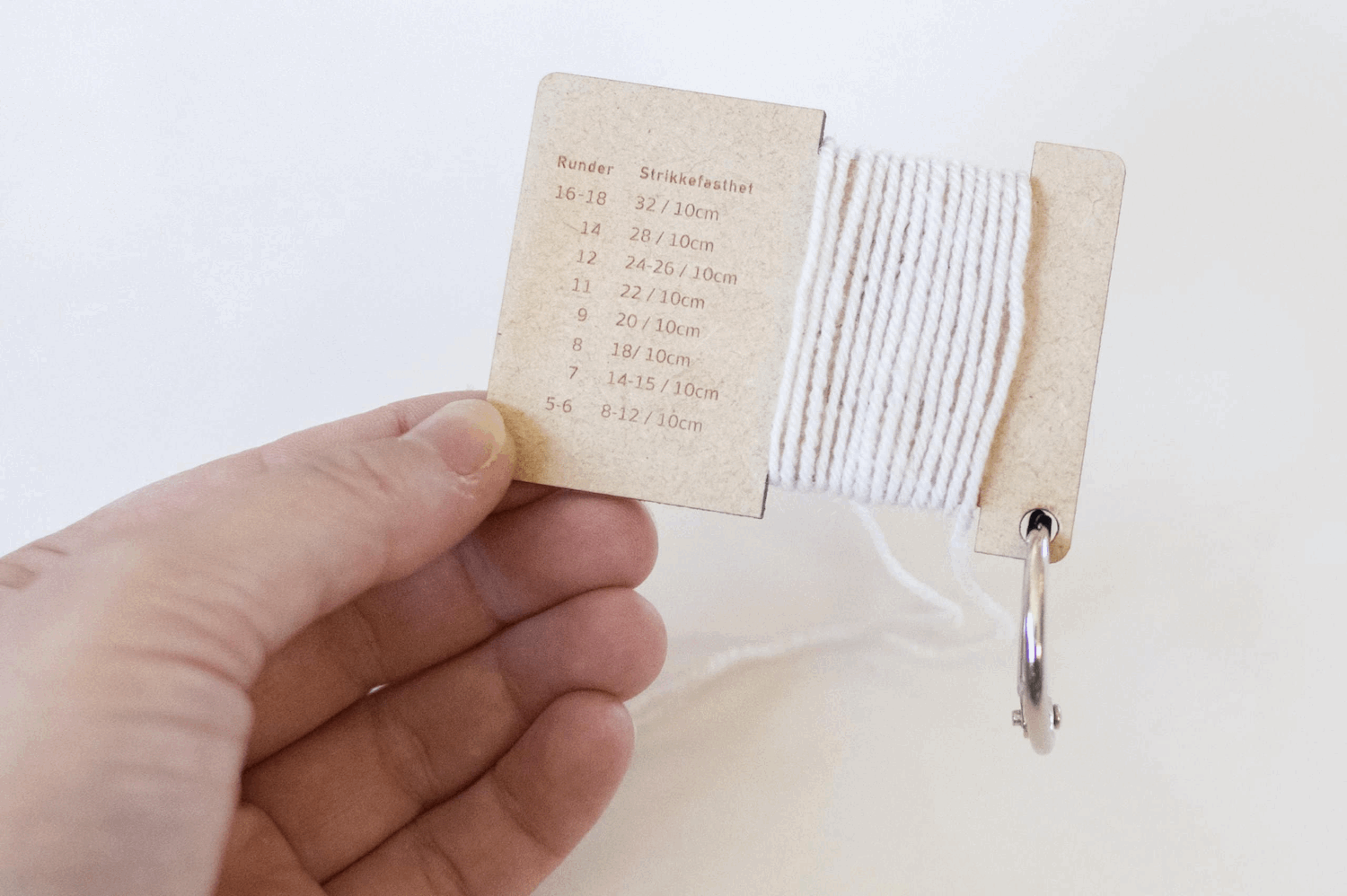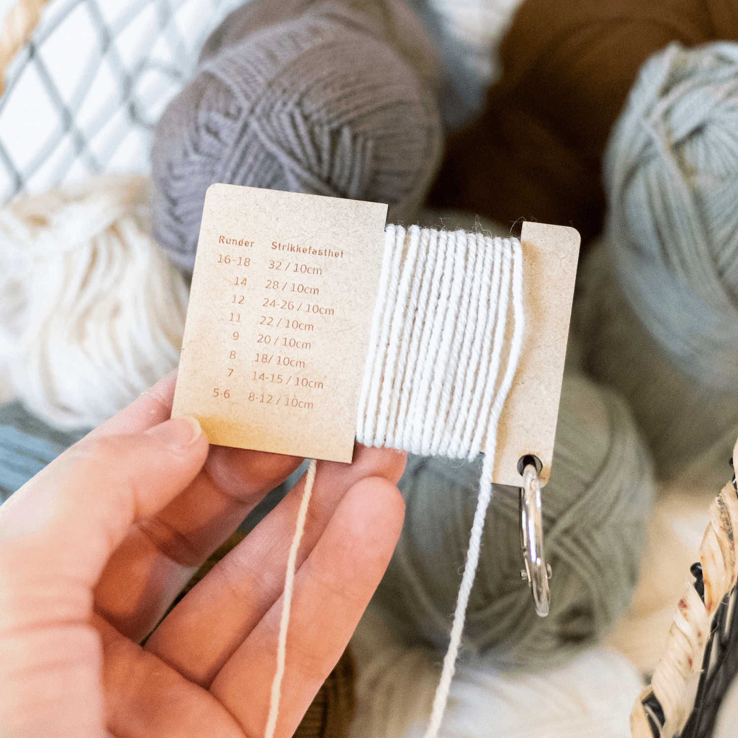 Har du ukjent garn i lageret ditt? Med garnmåleren kan du finne tykkelsen på garnet, og dermed også anbefalt strikkefasthet. Snurr garnet løst rundt måleren for å finne antall omganger i bredden. Bruk oversikten på garnmåleren for å estimere strikkefastheten garnet vil gi. Måleren gir kun en indikasjon på strikkefasthet og hva garnet vil passe til.