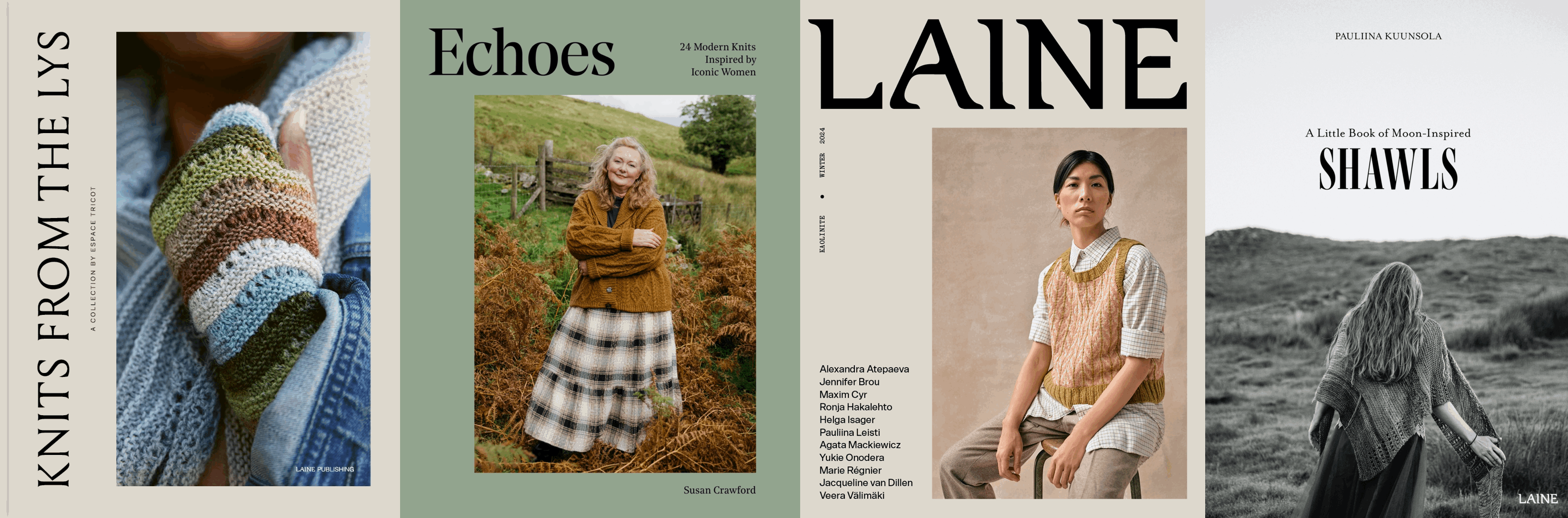 Laine henter inspirasjon fra hverdagsskjønnhet og er opptatt av bærekraft og mangfold. Med dette ønsker de å lage tidløse publikasjoner som varer hele livet. Vinterens utgivelse av Laine Magazine kommer snart, og i tillegg er de splitter nye bøkene Knits From the LYS, Echoes: 24 Modern Knits Inspired by Iconic Women og A Litte Book of Moon-Inspired Shawls rett rundt hjørnet. Alle de fire utgivelsene har engelsk tekst.